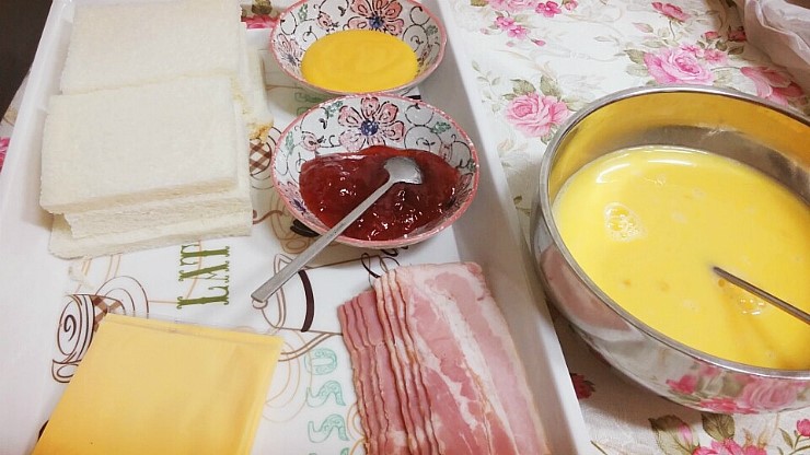 준비물 : 식빵, 버터, 머스터드소스, 딸기잼, 달걀, 베이컨이나 햄, 체다 치즈