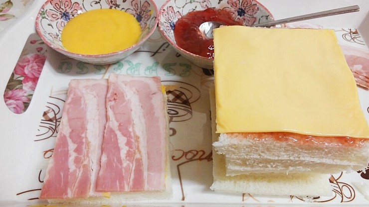 4) 머스터드를 바른 쪽에는 베이컨을 올려주시고 딸기잼을 바른 쪽에는 체다 치즈 한 장을 올려줍니다.